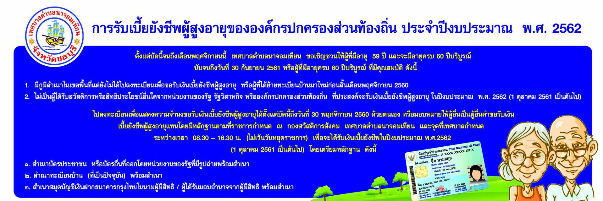 เทศบาลตำบลนาจอมเทียนขอเชิญชวนผู้ที่มีอายุ 59 ปี และจะมีอายุครบ 60 ปีบริบูรณ์ นับจนถึงวันที่ 30 กันยายน 2561 หรือผู้ที่มีอายุครบ 60 ปีบริบูรณ์ ที่มีคุณสมบัติ ดังนี้