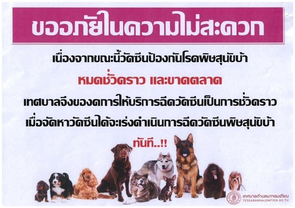 งานสัตวแพทย์ กองสาธารณสุขและสิ่งแวดล้อม เทศบาลตำบลนาจอมเทียน ขอแจ้งงดการให้บริการฉีดวัคซีนป้องกันโรคพิษสุนัขบ้าเป็นการชั่วคราว เนื่องจากวัคซีนป้องกันโรคพิษสุนัขบ้าหมดและขาดตลาด เมื่อเทศบาลฯจัดหาวัคซีนได้แล้วจะเร่งดำเนินการโดยทันที และขออภัยมา ณ โอกาสนี้