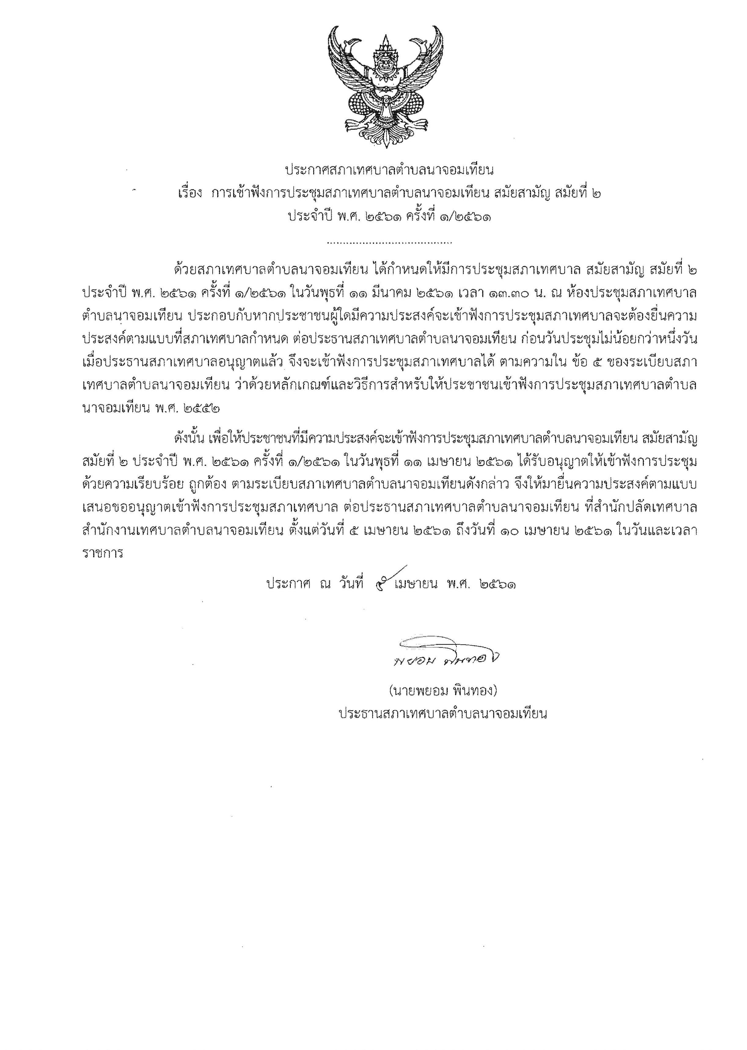 เรื่อง การเข้าฟังการประชุมสภาเทศบาลตำบลนาจอมเทียน สมัยสามัญ สมัยที่ ๒ ประจำปี พ.ศ.๒๕๖๑ ครั้งที่ ๑/๒๕๖๑ ในวันพุธที่ ๑๑ เมษายน ๒๕๖๑ เวลา ๑๓.๓๐ น. ณ ห้องประชุมสภาเทศบาลตำบลนาจอมเทียน