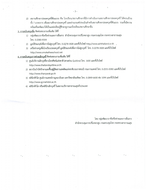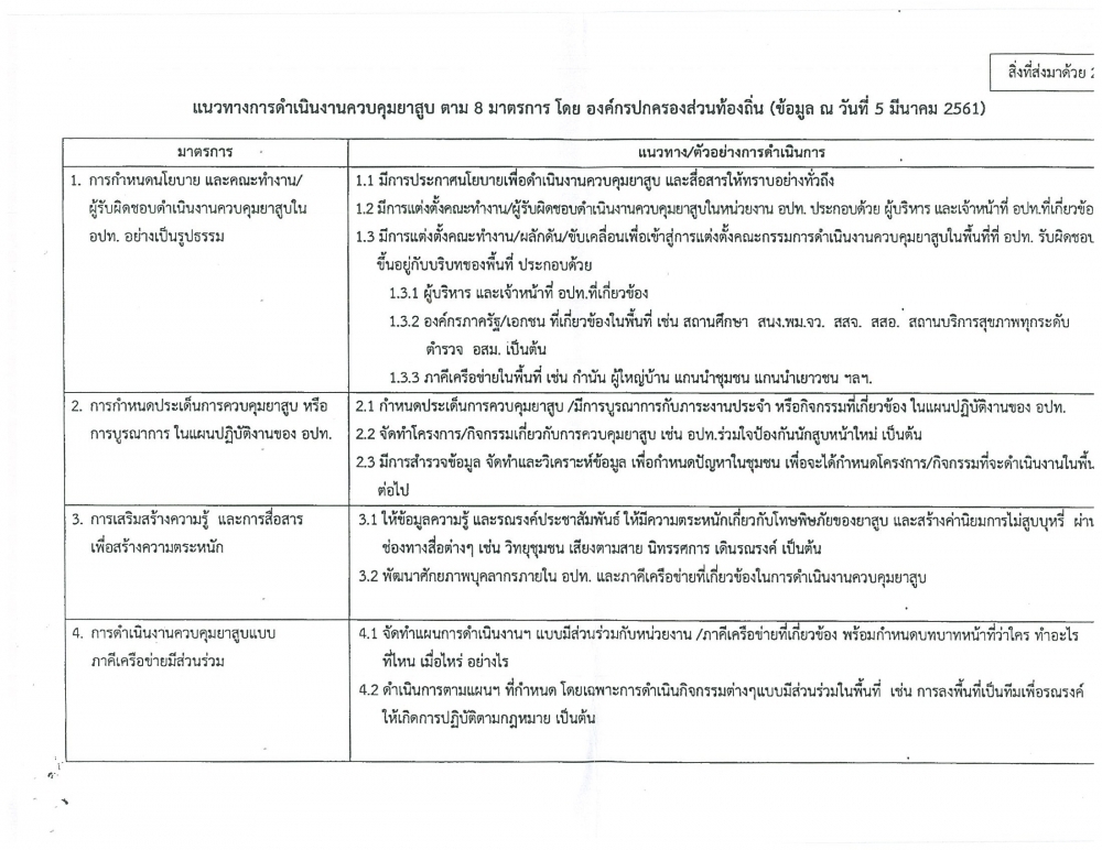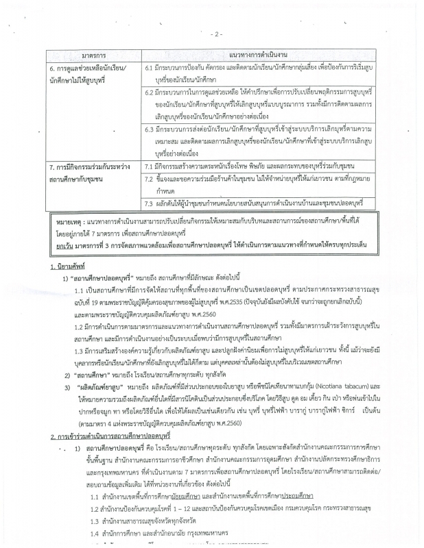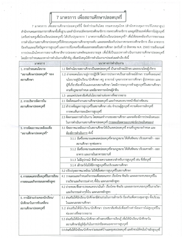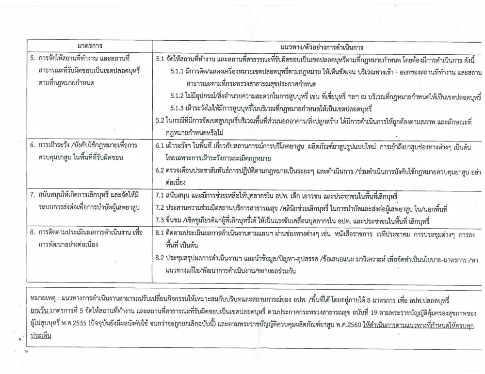 กรมควบคุมโรคแจ้งว่าการบริโภคยาสูบส่งผลกระทบทั้งด้านสุขภาพ เศรษฐกิจและสังคม ทำให้รัฐต้องเสียค่าใช้จ่ายในการดูแลรักษาเป็นจำนวนมาก กรมควบคุมโรค โดยสสำนักงานควบคุมการบริโภคยาสูบ จึงขับเคลื่อนการดำเนินงานควบคุมยาสูบ โดยองค์กรปกครองส่วนท้องถิ่นแบบภาคเครือข่ายมีส่วนร่วม จึงได้เผยแพร่การดำเนินงานตามแนวทางการดำเนินงานควบคุมยาสูบตาม ๘ มาตรการ และให้สถานศึกษาในสังกัดองค์กรปกครองส่วนท้องถิ่นเป็นสถานศึกษาปลอดบุหรี่ ดำเนินการตามมาตรการ ๗ มาตรการ ดังนี้