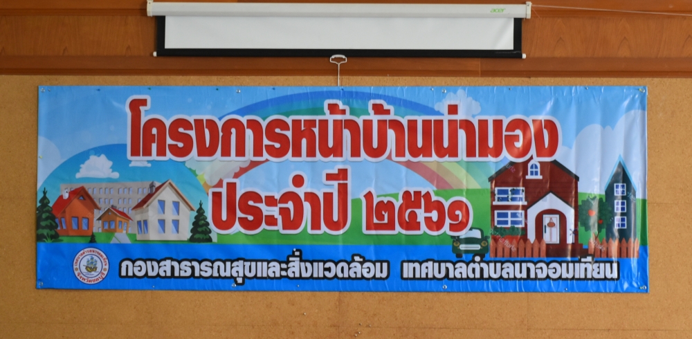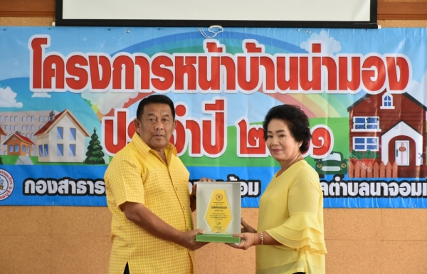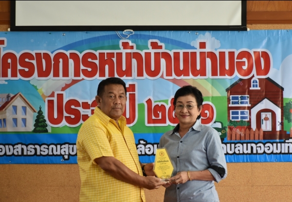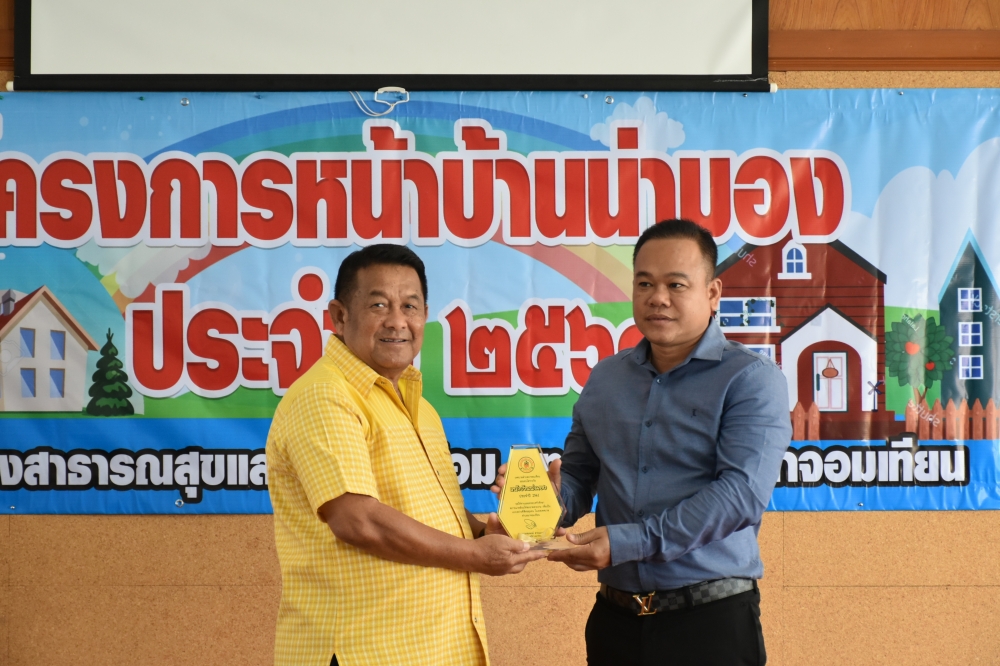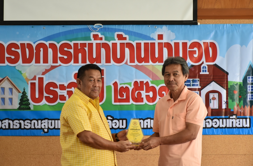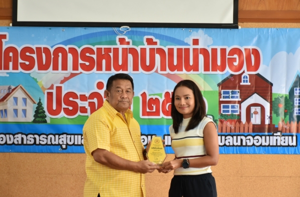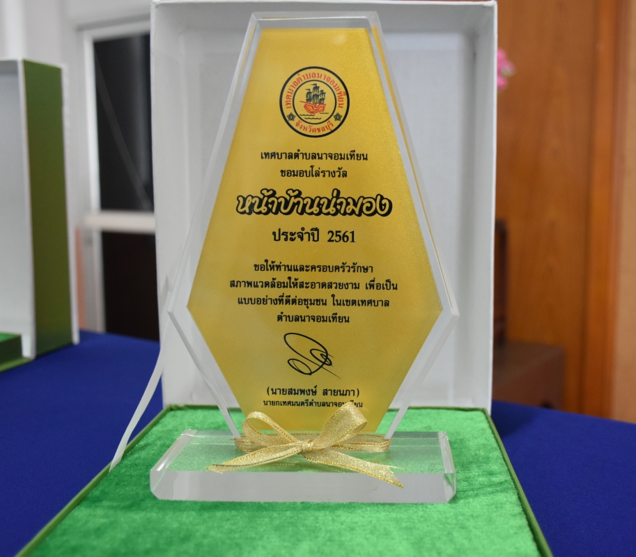 นายสมพงษ์ สายนภา นายกเทศมนตรีตำบลนาจอมเทียน มอบโล่รางวัลประกาศเกียรติคุณให้กับบ้านที่ผ่านเกณฑ์การประกวดตามโครงการหน้าบ้านน่ามอง ประจำปี 2561 เมื่อวันที่ 2 สิงหาคม 2561 เวลา 9.30 น. ณ ห้องประชุมชั้น 4 สำนักงานเทศบาลตำบลนาจอมเทียน