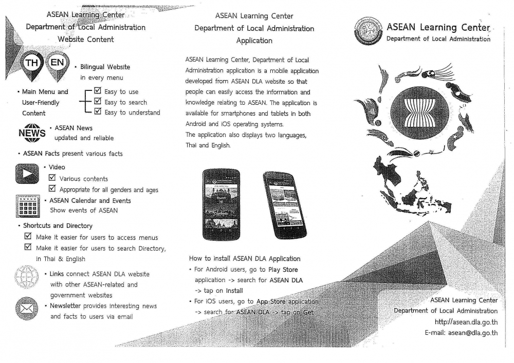 กรมส่งเสริมการปกครองท้องถิ่น ได้จัดทำเว็บไซต์ศูนย์การเรียนรู้ท้องถิ่น http://asean.dla.go.th แอปพลิเคชันศูนย์การเรียนรู้อาเซียน ASEAN DLA ที่สามารถใช้งานได้กับสมาร์ทโฟน ที่รองรับระบบปฏิบัติการ Android และระบบปฏิบัติการ IOS เพื่อใช้ประโยชน์ในด้านการเรียนการสอนและติดตามข้่อมูลข่าวสารความเคลื่อนไหวทางเศรษฐกิจของประชาคมเศรษฐกิจอาเซียน