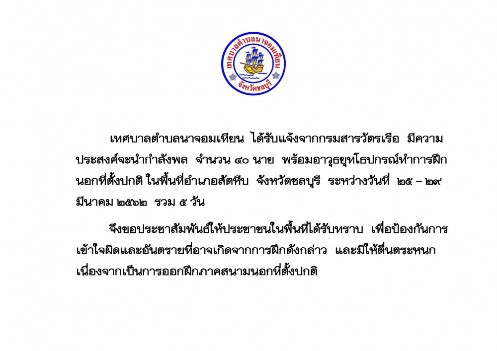 กรมสารวัตรทหารเรือมีความประสงค์จะนำกำลังพลทำการฝึกนอกที่ตั้งปกติ ในพื้นที่อำเภอสัตหีบ จังหวัดชลบุรี