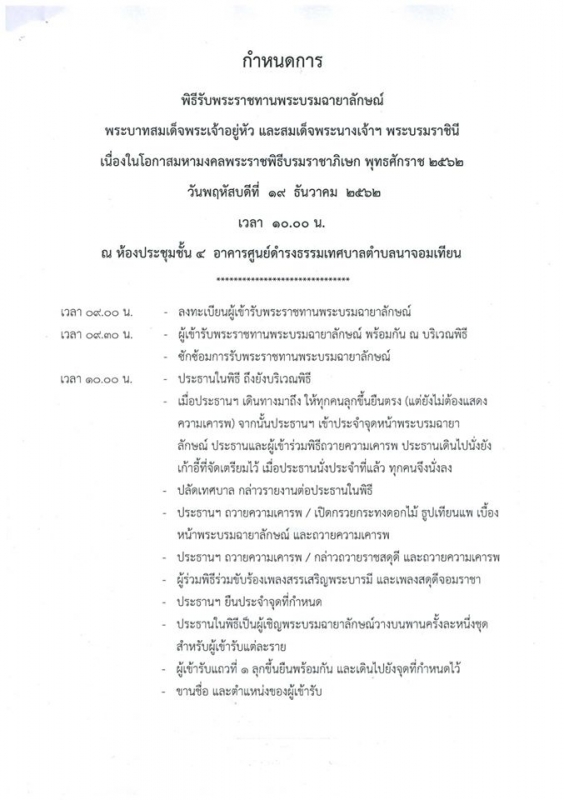 เทศบาลตำบลนาจอมเทียนขอเชิญประชาชน ผู้ประกอบการ หน่วยงาน และองค์กรต่างๆ เข้าร่วมพิธีพระราชทานพระบรมฉายาลักษณ์ พระบาทสมเด็จพระเจ้าอยู่หัวและสมเด็จพระนางเจ้าฯ พระบรมราชินี เนื่องในโอกาสมหามงคลพระราชพิธีบรมราชาภิเษก พุทธศักราช ๒๕๖๒ วันพฤหัสบดีที่ ๑๙ ธันวาคม ๒๕๖๒ เวลา ๑๐.๐๐ น. ณ ห้องประชุมชั้น ๔ อาคารศูนย์ดำรงธรรมเทศบาลตำบลนาจอมเทียน