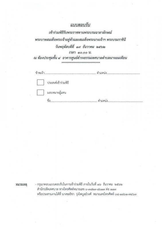โดยให้ส่งใบตอบรับในการเข้าร่วมพิธี ภายในวันที่ ๑๖ ธันวาคม ๒๕๖๒ สอบถามรายละเอียดเพิ่มเติม ได้ที่ สำนักปลัดเทศบาล ๐-๓๘๒๓-๘๖๑๓ ต่อ ๑๑๓ หรือคุณชลธิชา รุ่งไพบูลย์วงศ์ ๐๘-๑๘๖๑-๗๔๖๓