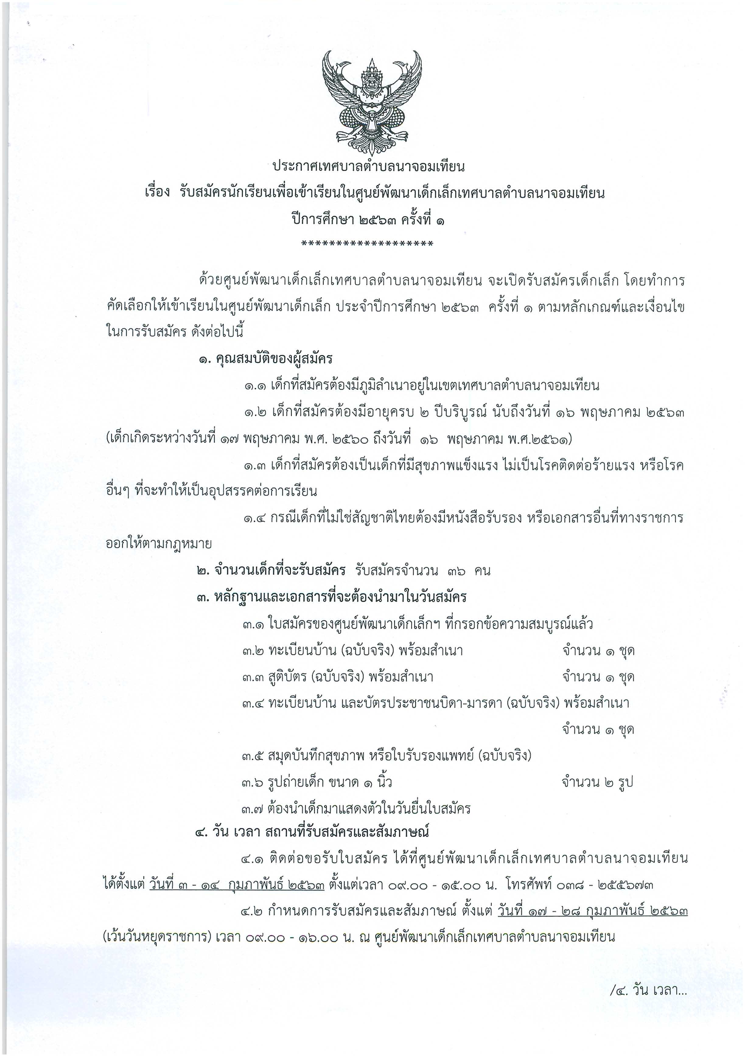 ประกาศเทศบาลตำบลนาจอมเทียน รับสมัครนักเรียนเพื่อเข้าเรียนรู้ในศูนย์พัฒนาเด็กเล็ก ปีการศึกษา 2563 ครั้งที่ 1