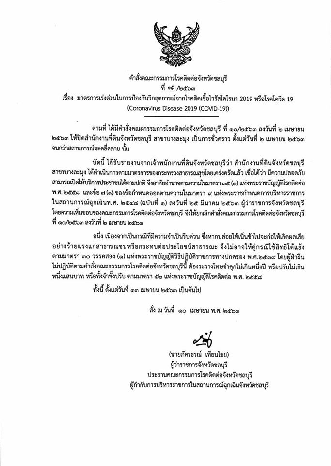 คำสั่งคณะกรรมการโรคติดต่อจังหวัดชลบุรี ที่ 15