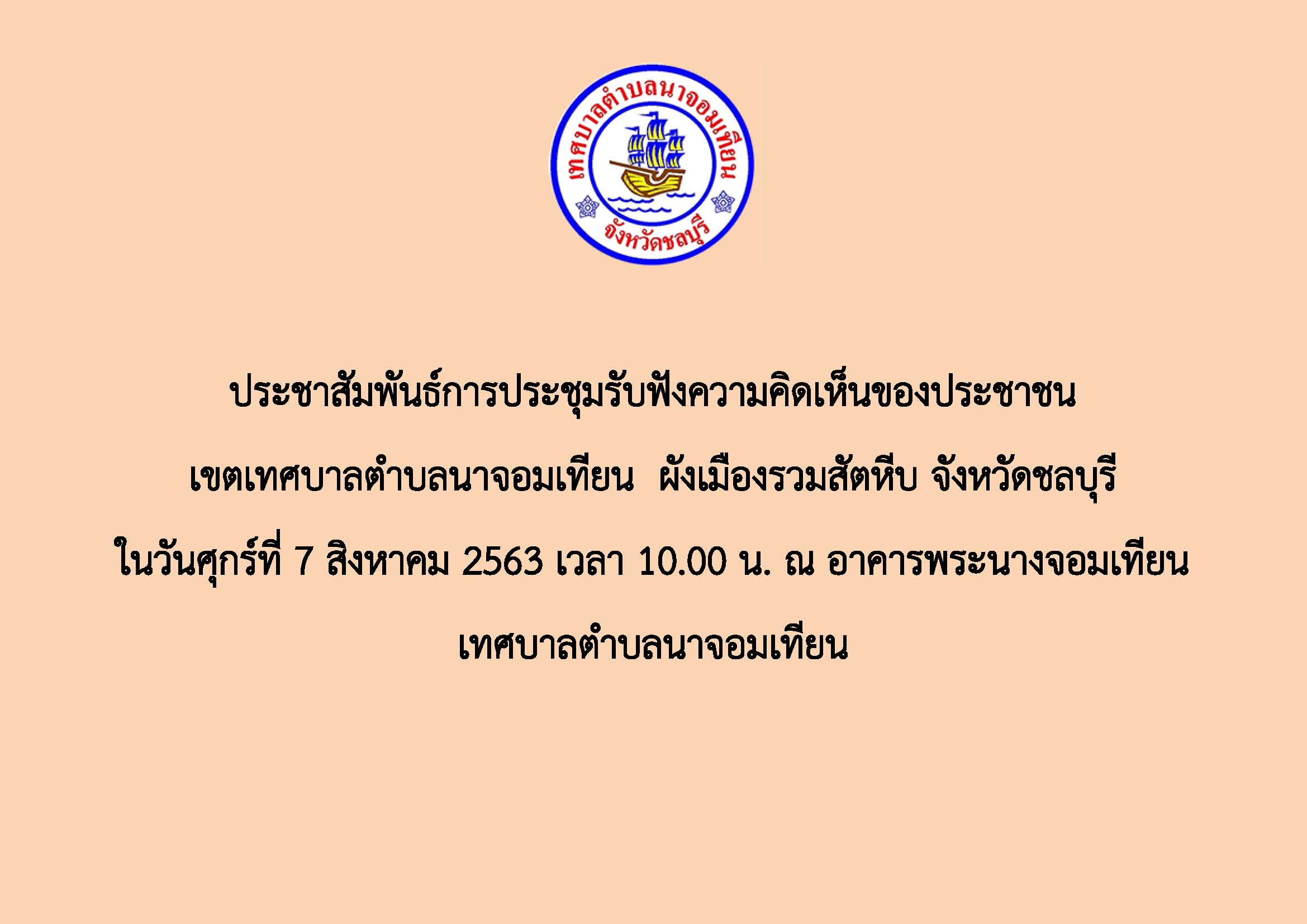 เทศบาลตำบลนาจอมเทียนขอเชิญประชาชนเข้าร่วมประชุมเพื่อแสดงความคิดเห็นเกี่ยวกับผังเมืองรวมสัตหีบ ในวันศุกร์ที่ 7 สิงหาคม 2563 เวลา 10.00 น ณ อาคารพระนางจอมเทียน สวนสาธารณะชายหาดบ้านอำเภอ