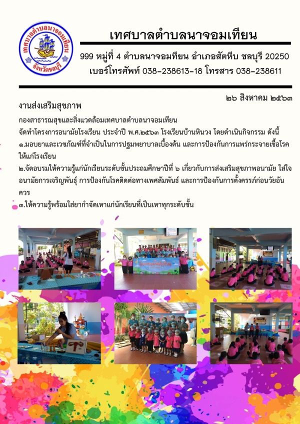 2.จัดอบรมให้ความรู้แก่นักเรียนระดับชั้นประถมศึกษาปีที่ 6 เกี่ยวกับการส่งเสริมสุขภาพอนามัย ใส่ใจอนามัยการเจริญพันธุ์ การป้องกันโรคติดต่อทางเพศสัมพันธ์ และการป้องกันการตั้งครรภ์ก่อนวัยอันควร