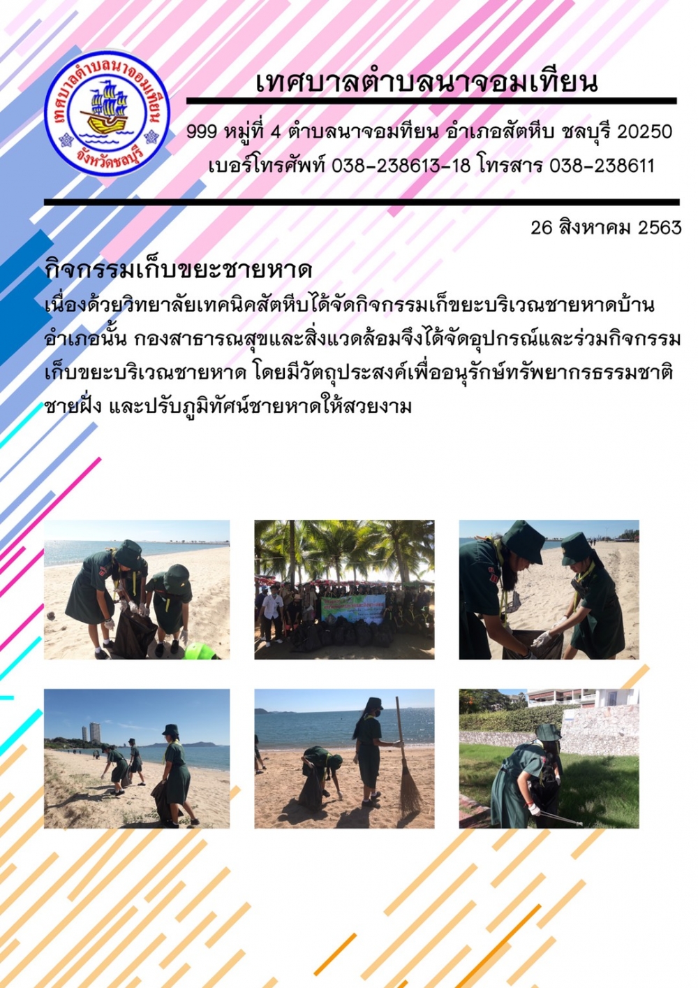 กองสาธารณสุขและสิ่งแวดล้อมร่วมกับวิทยาลัยเทคนิคสัตหีบ นำนักเรียนลูกเสือ เนตรนารีจำนวน50คนทำกิจกรรมบำเพ็ญประโยชน์เก็บขยะบริเวณชายหาดบ้านอำเภอ โดยมีวัตถุประสงค์เพื่ออนุรักษ์ทรัพยากรธรรมชาติชายฝั่ง และปรับภูมิทัศน์ชายหาดให้สวยงาม