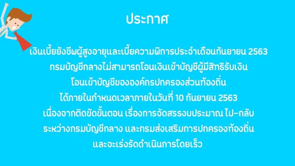 กรมบัญชีกลางไม่สามารถโอนเงินเข้าบัญชีผู้มีสิทธิรับเงินและโอนเข้าบัญชีขององค์กรปกครองส่วนท้องถิ่นได้ภายในกำหนดเวลาภายในวันที่ 10 กันยายน 2563
