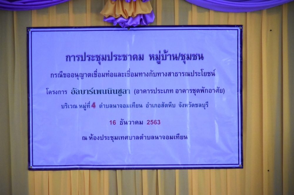 16 ธันวาคม 2563 เทศบาลตำบลนาจอมเทียน นำโดยนายสมพงษ์ สายนภา นายกเทศมนตรึตำบลนาจอมเทียน จัดการประชุมประชาคม หมู่บ้าน/ชุมชน กรณีขออนุญาตเชื่อมท่อและเชื่อมทางกับสาธารณประโยชน์โครงการ อัลบาร์เพนนินซูลา (อาคารประเภท อาคารชุดพักอาศัย) บริเวณหมู่ที่ 4 ตำบลนาจอมเทียน อำเภอสัตหีบ จังหวัดชลบุรี ณ ห้องประชุมชั้น 4 เทศบาลตำบลนาจอมเทียน