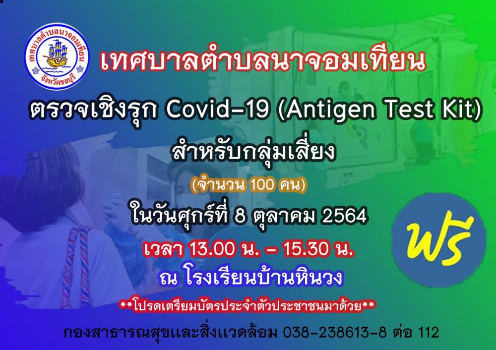 เทศบาลตำบลนาจอมเทียนจะดำเนินการตรวจเชิงรุกคัดกรองหาเชื้อโควิด-19 ฟรี !!! ด้วยชุดตรวจ Antigen Test Kit สำหรับกลุ่มเสี่ยง จำนวน 100 ราย โปรดนำบัตรประจำตัวประชาชนมาแสดงตนเพื่อรับการตรวจ ในวันศุกร์ที่ 8 ตุลาคม 2564 เวลา 13.00 - 15.30 น. ณ โรงเรียนบ้านหินวง สอบถามรายละเอียดเพิ่มเติม ได้ที่ กองสาธารณสุขและสิ่งแวดล้อม 038 238613-8 ต่อ 112