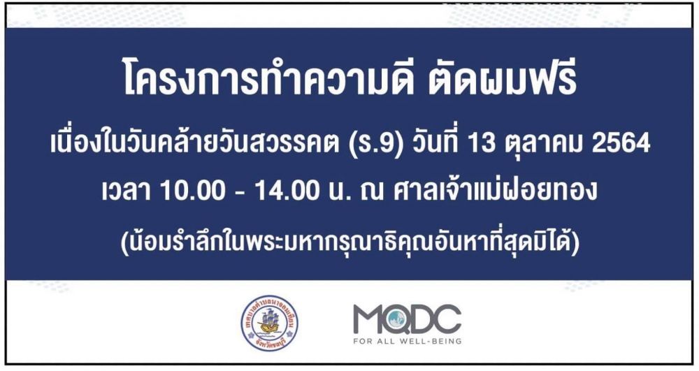 ขอเชิญร่วมโครงการทำความดี ตัดผมฟรี เนื่องในวันสวรรคตพระบาทสมเด็จพระบรมชนกาธิเบศร มหาภูมิพลอดุลยเดช บรมนาถบพิตร(ร.9) ในวันที่ 13 ตุลาคม 2564 เวลา 10.00-14.00 น. ณ ศาลเจ้าแม่ฝอยทอง น้อมรำลึกในพระมหากรุณาธิคุณอันหาที่สุดมิได้