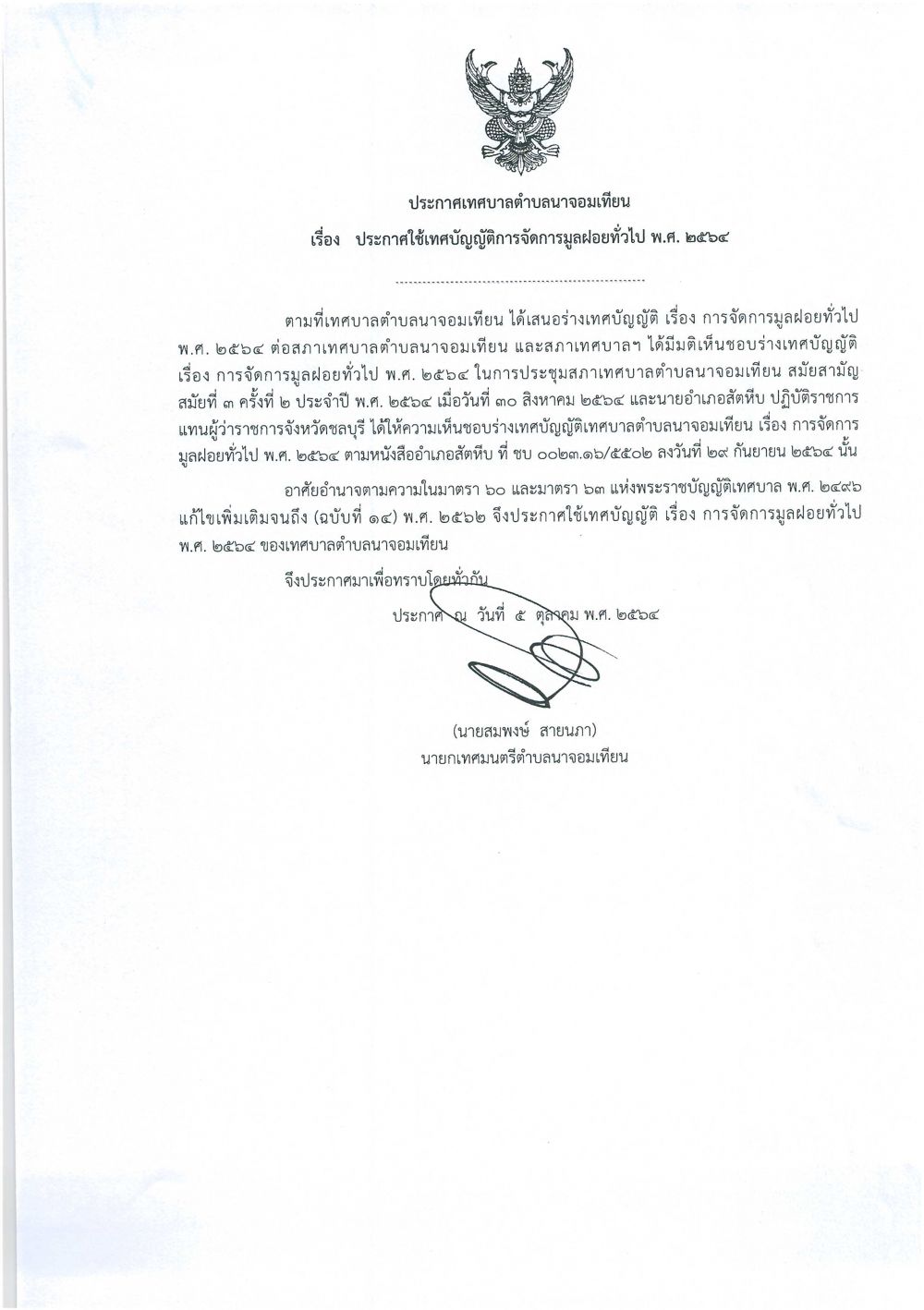 *ประกาศเทศบาลตำบลนาจอมเทียน เรื่อง ประกาศใช้เทศบัญญัติการจัดการมูลฝอยทั่วไป พ.ศ.๒๕๖๔