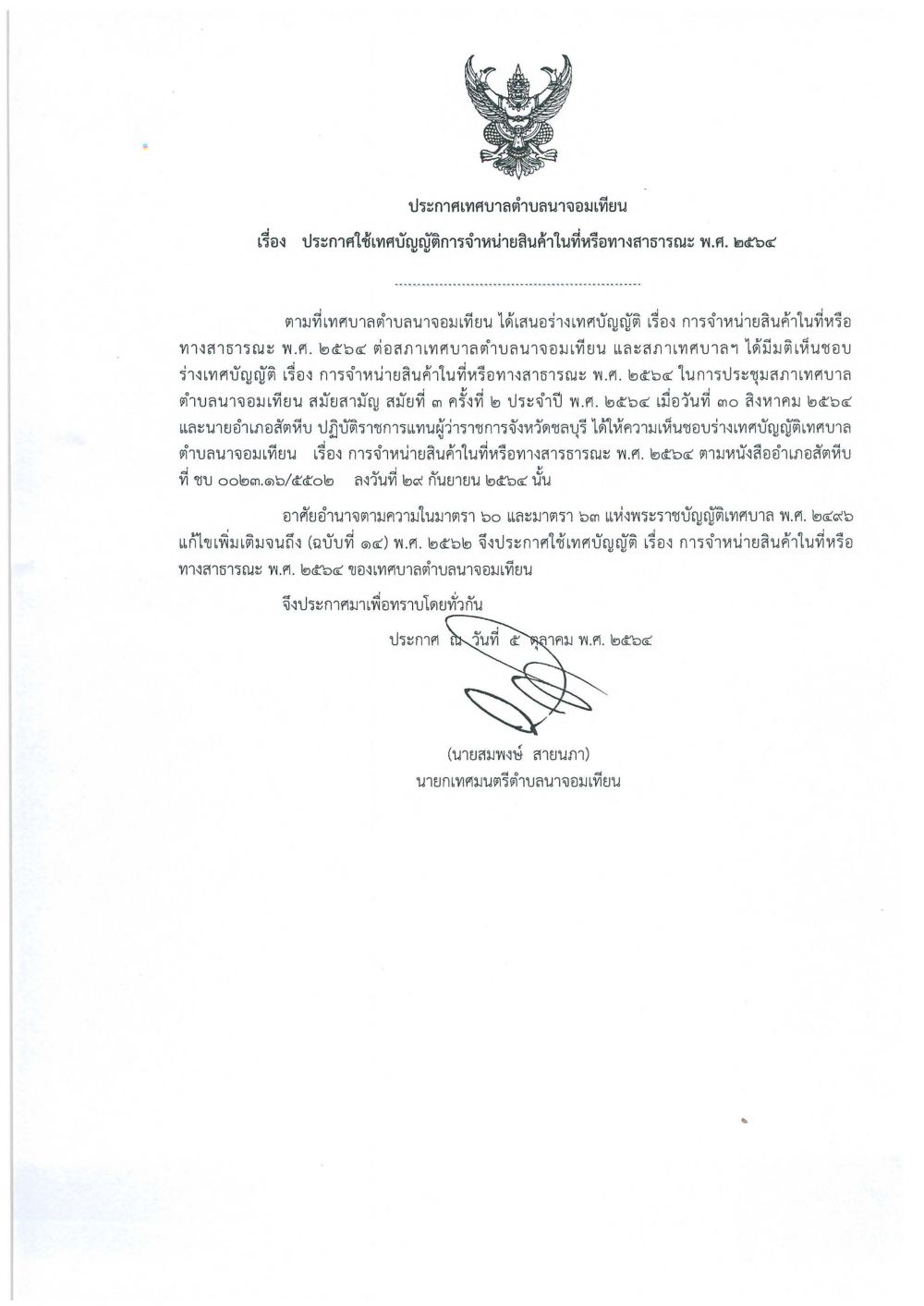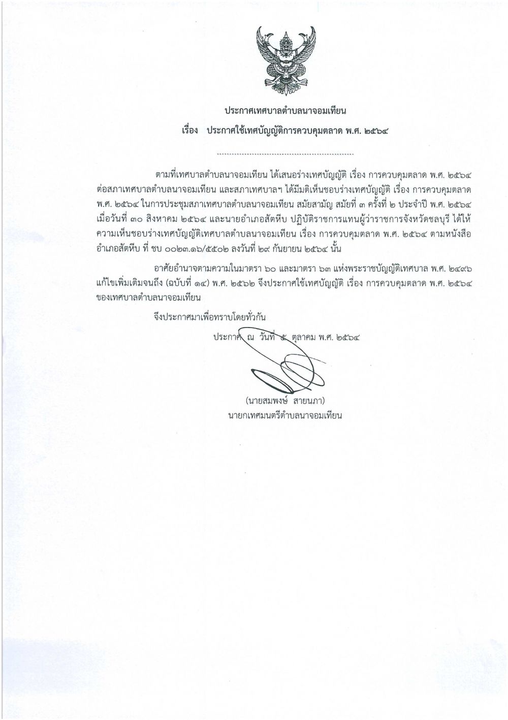 *ประกาศเทศบาลตำบลนาจอมเทียน เรื่อง ประกาศใช้เทศบัญญัติการควบคุมตลาด พ.ศ.๒๕๖๔