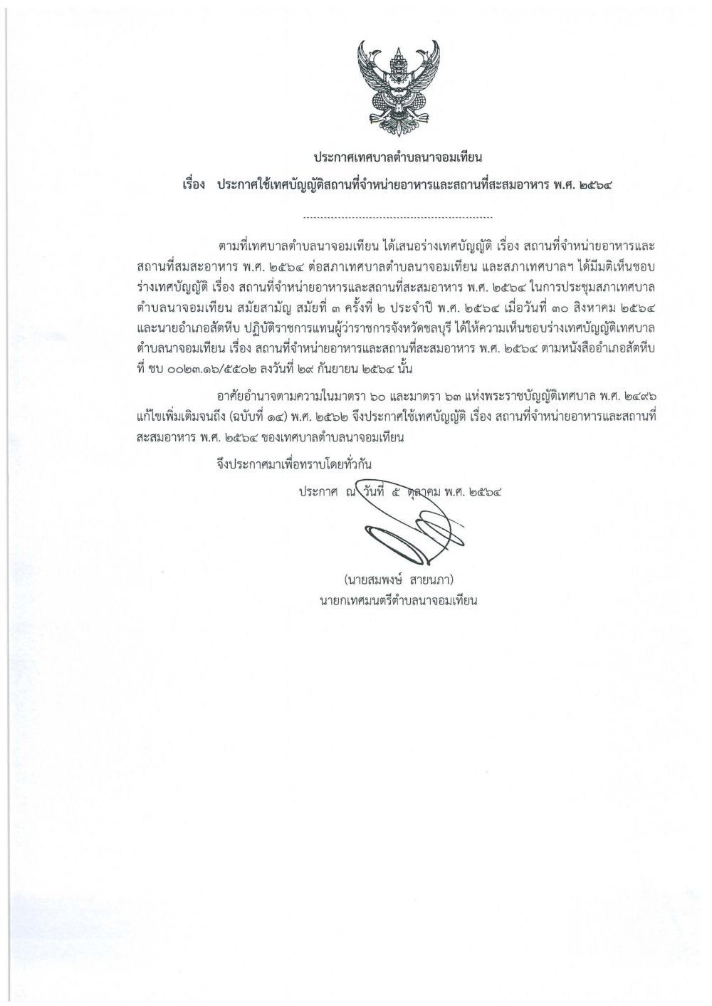 *ประกาศเทศบาลตำบลนาจอมเทียน เรื่อง ประกาศใช้เทศบัญญัติสถานที่จำหน่ายอาหารและสถานที่สะสมอาหาร พ.ศ.๒๕๖๔
