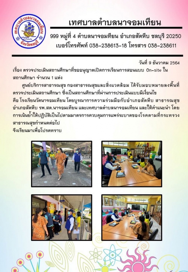 คือ...โรงเรียนวัดนาจอมเทียน....โดยบูรณาการความร่วมมือกับอำเภอสัตหีบ สาธารณสุขอำเภอสัตหีบ รพ.สต.นาจอมเทียน และเทศบาลตำบลนาจอมเทียน และให้คำแนะนำ โดยการเน้นย้ำให้ปฏิบัติเป็นไปตามมาตรการควบคุมการแพร่ระบาดของโรคตามที่กระทรวงสาธารณสุขกำหนดต่อไป