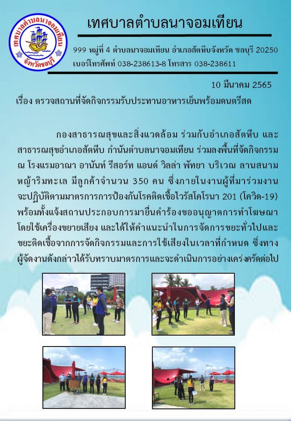 กองสาธารณสุขและสิ่งแวดล้อม ร่วมกับอำเภอสัตหีบ เและสาธารณสุขอำเภอสัตหีบ กำนันตำบลนาจอมเทียน ร่วมลงพื้นที่จัดกิจกรรม ณ โรงแรมอาณา อานันท์ รีสอร์ท แอนด์ วิลล่า พัทยา บริเวณ ลานสนามหญ้าริมทะเล มีลูกค้าจำนวน 350 คน ซึ่งภายในงานผู้ที่มาร่วมงานจะปฏิบัติตามมาตรการการป้องกันโรคติดเชื้อไวรัสโคโรนา 2019 (โควิด-19) พร้อมทั้งแจ้งสถานประกอบการมายื่นคำร้องขออนุญาตการทำโฆษณาโดยใช้เครื่องขยายเสียง และได้ให้คำแนะนำในการจัดการขยะทั่วไปและขยะติดเชื้อ จากการจัดกิจกรรมและการใช้เสียงในเวลาที่กำหนด ซึ่งทางผู้จัดงานดังกล่าวได้รับทราบมาตรการและจะดำเนินการอย่างเคร่งครัดต่อไป