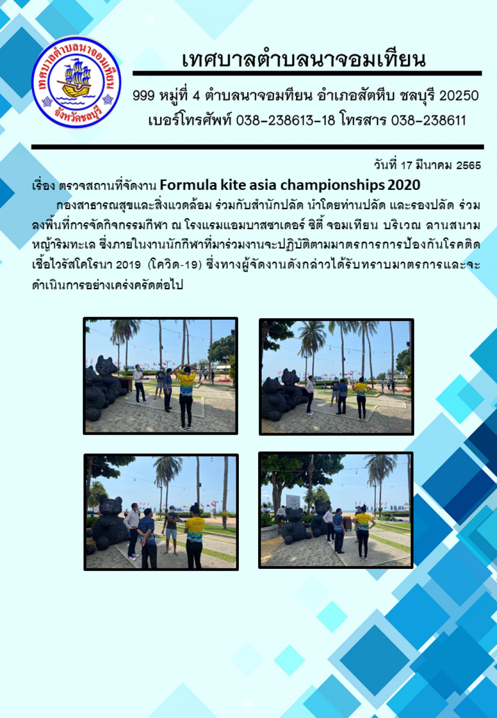กองสาธารณสุขและสิ่งแวดล้อม ร่วมกับสำนักปลัด นำโดยท่านปลัด และรองปลัด ร่วมลงพื้นที่การจัดกิจกรรมกีฬา ณ โรงแรมแอมบาสซาเดอร์ ซิตี้ จอมเทียน บริเวณ ลานสนามหญ้าริมทะเล ซึ่งภายในงานนักกีฬาที่มาร่วมงานจะปฏิบัติตามมาตรการการป้องกันโรคติดเชื้อไวรัสโคโรนา 2019 (โควิด-19) ซึ่งทางผู้จัดงานดังกล่าวได้รับทราบมาตรการและจะดำเนินการอย่างเคร่งครัดต่อไป