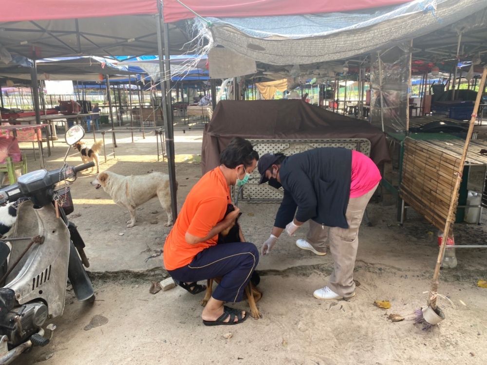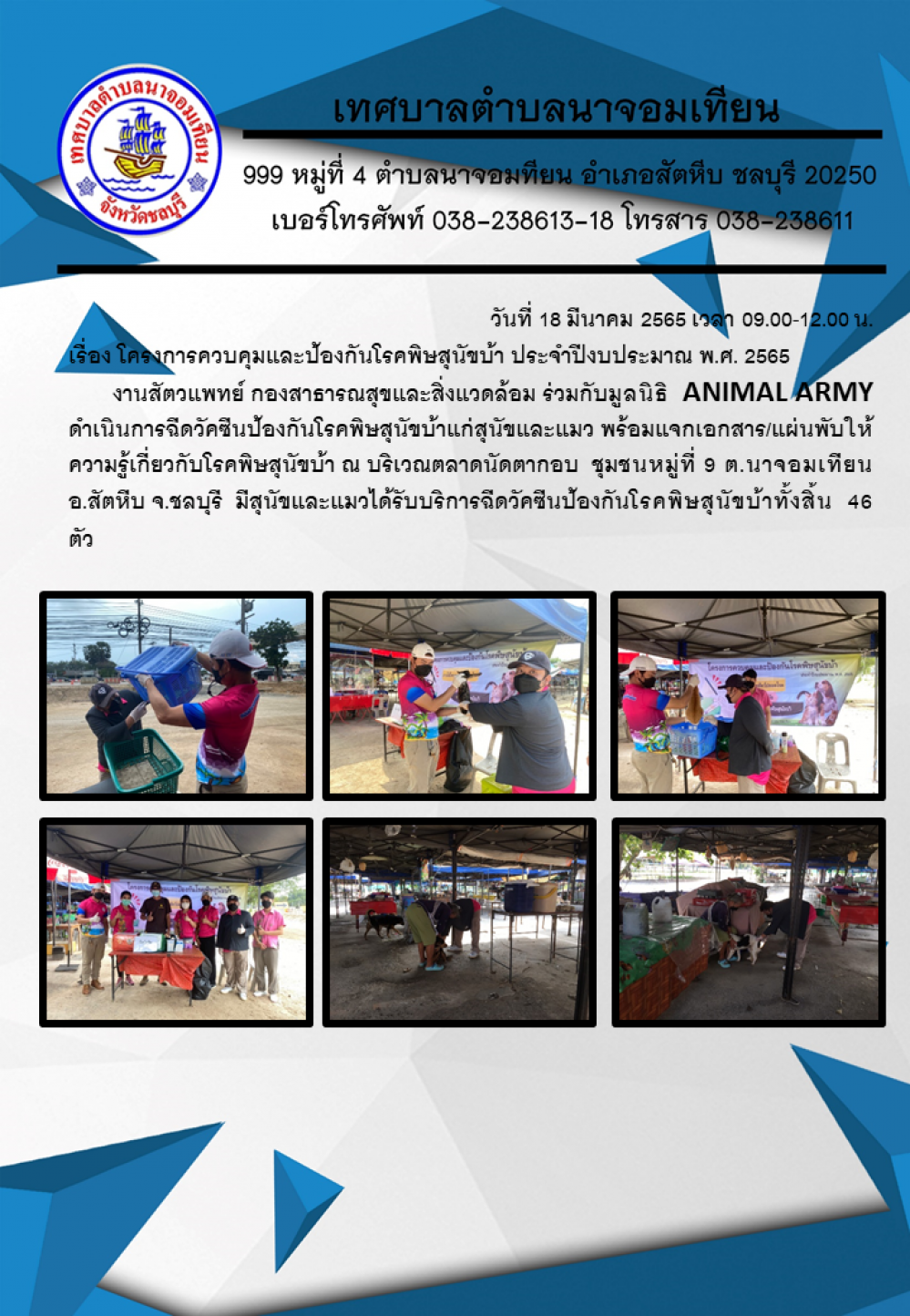 งานสัตวแพทย์ กองสาธารณสุขและสิ่งแวดล้อม ร่วมกับมูลนิธิ ANIMAL ARMY ดำเนินการฉีดวัคซีนป้องกันโรคพิษสุนัขบ้าแก่สุนัขและแมว พร้อมแจกเอกสาร/แผ่นพับให้ความรู้เกี่ยวกับโรคพิษสุนัขบ้า ณ บริเวณตลาดนัดตากอบ ชุมชนหมู่ที่ 9 ต.นาจอมเทียน อ.สัตหีบ จ.ชลบุรี มีสุนัขและแมวได้รับบริการฉีดวัคซีนป้องกันโรคพิษสุนัขบ้าทั้งสิ้น 46 ตัว