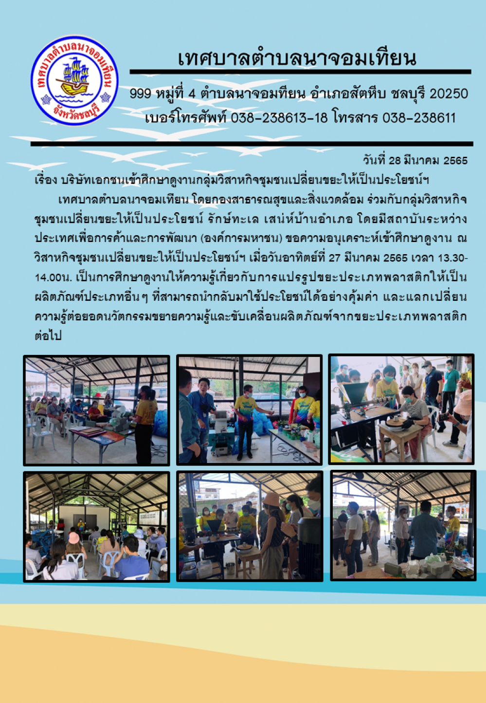 เทศบาลตำบลนาจอมเทียน โดยกองสาธารณสุขและสิ่งแวดล้อม ร่วมกับกลุ่มวิสาหกิจชุมชนเปลี่ยนขยะให้เป็นประโยชน์ รักษ์ทะเล เสน่ห์บ้านอำเภอ โดยมีสถาบันระหว่างประเทศเพื่อการค้าและการพัฒนา (องค์การมหาชน) ขอความอนุเคราะห์เข้าศึกษาดูงาน ณ วิสาหกิจชุมชนเปลี่ยนขยะให้เป็นประโยชน์ฯ เมื่อวันอาทิตย์ที่ 27 มีนาคม 2565 เวลา 13.30-14.00น. เป็นการศึกษาดูงานให้ความรู้เกี่ยวกับการแปรรูปขยะประเภทพลาสติกให้เป็นผลิตภัณฑ์ประเภทอื่นๆ ที่สามารถนำกลับมาใช้ประโยชน์ได้อย่างคุ้มค่า และแลกเปลี่ยนความรู้ต่อยอดนวัตกรรมขยายความรู้และขับเคลื่อนผลิตภัณฑ์จากขยะประเภทพลาสติกต่อไป