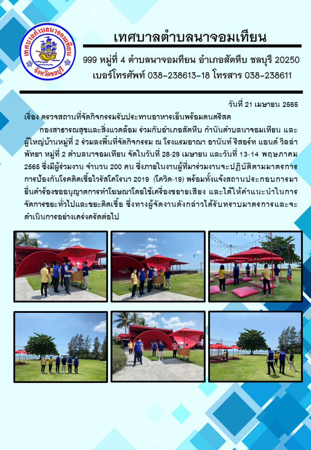 วันที่ 21 เมษายน 2565 ด้วยกองสาธารณสุขและสิ่งแวดล้อม ร่วมกับอำเภอสัตหีบ กำนันตำบลนาจอมเทียน และผู้ใหญ่บ้านหมู่ที่ 2 ร่วมลงพื้นที่จัดกิจกรรม ณ โรงแรมอาณา อานันท์ รีสอร์ท แอนด์ วิลล่า พัทยา หมู่ที่ 2 ตำบลนาจอมเทียน จัดในวันที่ 28-29 เมษายน และวันที่ 13-14 พฤษภาคม 2565 ซึ่งมีผู้ร่วมงาน จำนวน 200 คน ซึ่งภายในงานผู้ที่มาร่วมงานจะต้องปฎิบัติตามมาตรการการป้องกันโรคติดเชื้อโคโรนา 2019 (โควิค-19) พร้อมทั้งแจ้งสถานประกอบการมายื่นคำร้องขออนุญาตการทำโฆษณาโดยใช้เครื่องขยายเสียง และได้ให้คำแนะนำในการจัดการขยะทั่วไปและขยะติดเชื้อ ซึ่งทางผู้จัดงานดังกล่าวได้รับทราบมาตรการและจะดำเนินการอย่างเคร่งครัด
