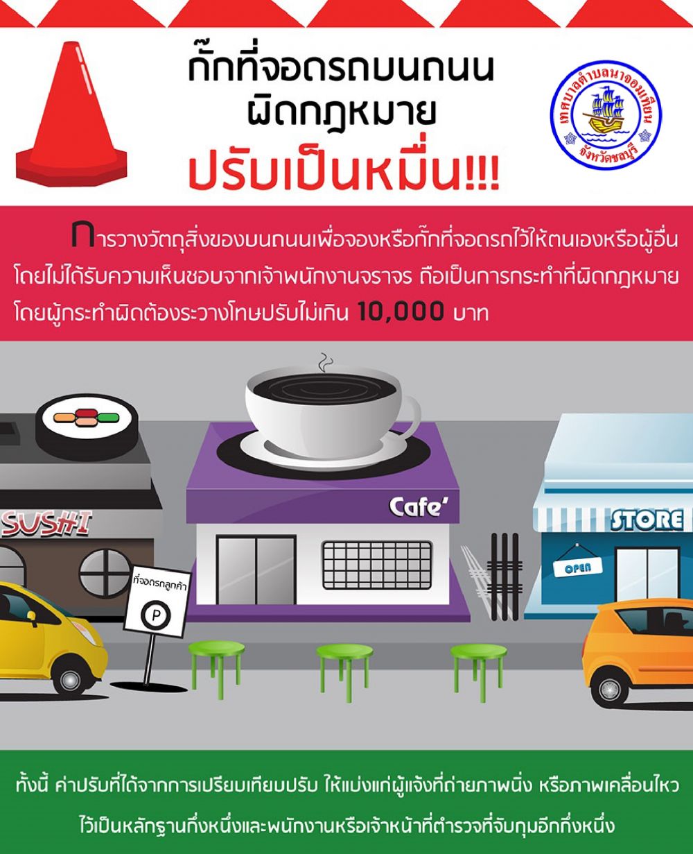ประกาศประชาสัมพันธ์จากเทศบาลตำบลนาจอมเทียน ขอประชาสัมพันธ์ให้ประชาชนและผู้ประกอบการจำหน่ายอาหาร รถเข็นเร่ขาย ทุกท่านทราบ ขอให้ดำเนินการตามพระราชบัญญัติรักษาความสะอาดและความเป็นระเบียบเรียบร้อยของบ้านเมือง พ.ศ. 2535 และพระราชบัญญัติจราจรทางบก พ.ศ. ๒๕๒๒ ในพื้นที่ถนนชายหาดนาจอมเทียนและถนนภายในเขตเทศบาลตำบลนาจอมเทียน ดังนี้ โดยขอความร่วมมือให้ปฏิบัติตาม “มาตรา ๑๑๔ ห้ามมิให้ผู้ใดวาง ตั้ง ยื่น หรือแขวนสิ่งใดสิ่งหนึ่ง หรือกระทำด้วยประการใด ๆ ในลักษณะที่เป็นการกีดขวางการจราจร เว้นแต่ได้รับอนุญาตเป็นหนังสือจากหัวหน้าเจ้าพนักงานจราจร* แต่หัวหน้าเจ้าพนักงานจราจร*จะอนุญาตได้ต่อเมื่อมีเหตุอันจำเป็นและเป็นการชั่วคราวเท่านั้น ผู้ฝ่าฝืนบทบัญญัติในวรรคหนึ่ง นอกจากจะมีความผิดตามมาตรา ๑๔๘ แล้ว หัวหน้าเจ้าพนักงานจราจร*มีอำนาจสั่งให้ผู้ฝ่าฝืนรื้อถอนหรือเคลื่อนย้ายสิ่งกีดขวางดังกล่าวได้ ถ้าไม่ยอมรื้อถอนหรือเคลื่อนย้ายให้หัวหน้าเจ้าพนักงานจราจร* มีอำนาจรื้อถอนหรือเคลื่อนย้ายได้” แห่งพระราชบัญญัติจราจรทางบก พ.ศ. ๒๕๒๒ รวมทั้ง มาตรา 19 ห้ามมิให้ผู้ใดตั้ง วาง หรือกองวัตถุใดๆ บนถนนเว้นแต่เป็นการกระทําในบริเวณที่เจ้าพนักงานท้องถิ่นหรือพนักงานเจ้าหน้าที่ประกาศกําหนดด้วยความเห็นชอบของเจ้าพนักงานจราจร หากผู้ใดฝ่าฝืน ผู้ใดฝ่าฝืนหรือไม่ปฏิบัติตามมาตรา 19 ต้องระวางโทษปรับไม่เกินหนึ่งหมื่นตามมาตรา 57 พระราชบัญญัติรักษาความสะอาดและความเป็นระเบียบเรียบร้อยของบ้านเมือง พ.ศ. 2535 จึงขอประกาศมาให้ทราบโดยทั่วกัน