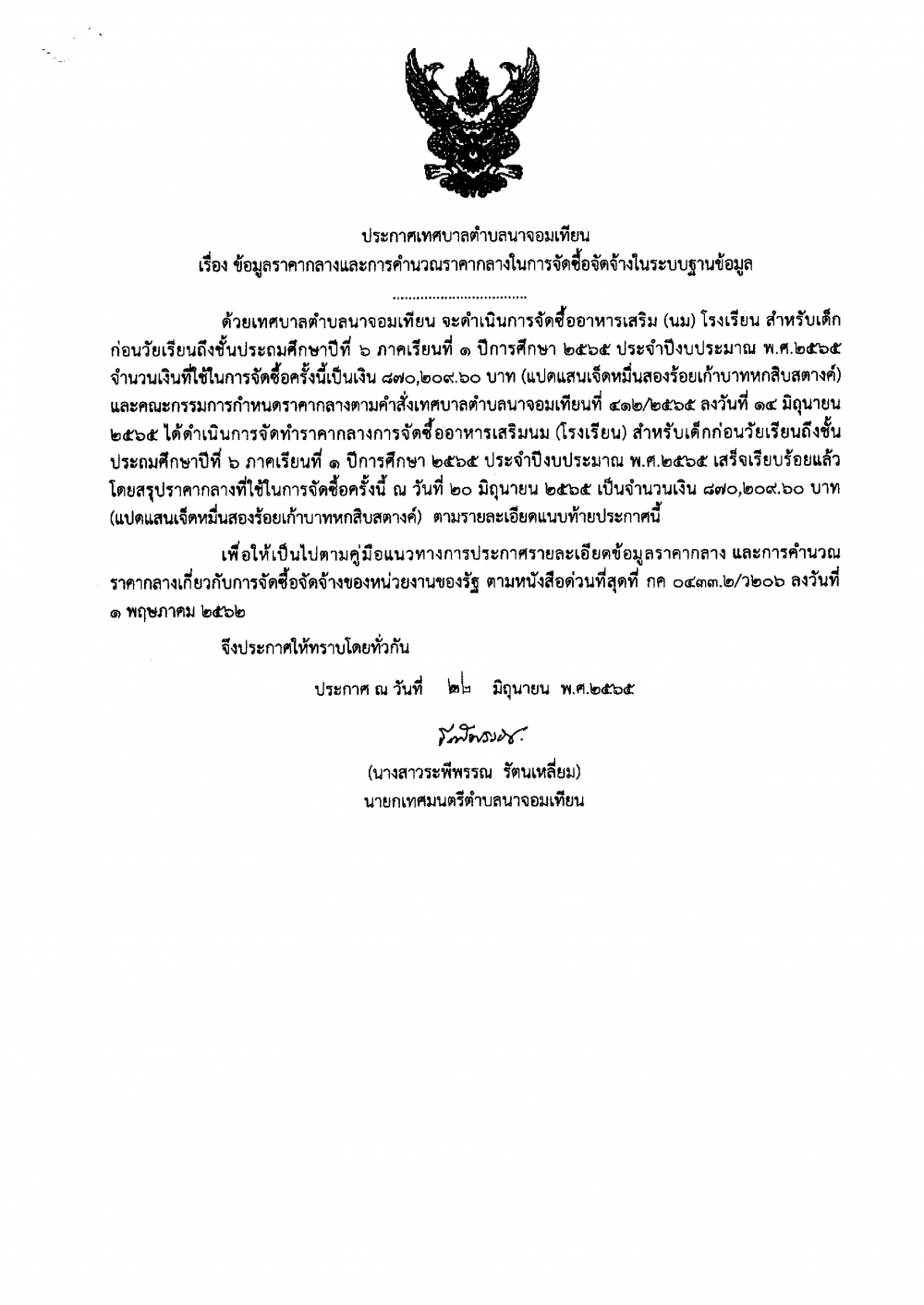 ข้อมูลราคากลางและการคำนวณราคากลางในการจัดซื้อจัดจ้างในระบบฐานข้อมูล เรื่องการจัดซื้ออาหารเสริม (นม)โรงเรียนสำหรับเด็กก่อนวัยเรียนถึงชั้นประถมศึกษาปีที่ ๖ ภาคเรียนที่๑