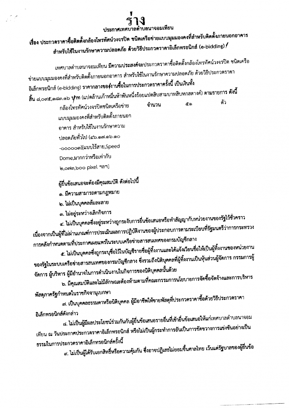 ประกวดราคาซื้อติดตั้งกล้องโทรทัศน์วงจรปิด ชนิดเครือข่ายแบบมุมมองคงที่สำหรับติดตั้งภายนอกอาคาร สำหรับใช้ในงานรักษาความปลอดภัย