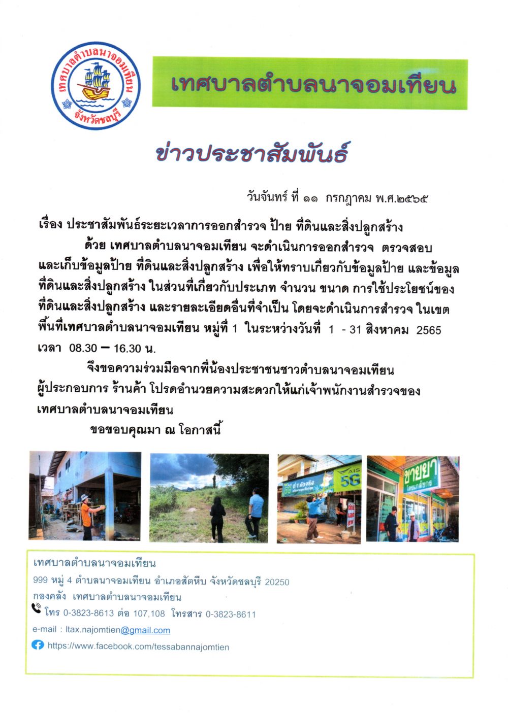 ด้วยเทศบาลตำบลนาจอมเทียน จะดำเนินการออกสำรวจ ตรวบสอบและเก็บข้อมูลป้าย ที่ดินและสิ่งปลูกสร้าง ภายในเขตเทศบาลตำบลนาจอมเทียน หมู่ที่ 1 ในระหว่างวันที่ 1- 31 สิงหาคม 2565 เวลา 8:30 - 16:30 น.