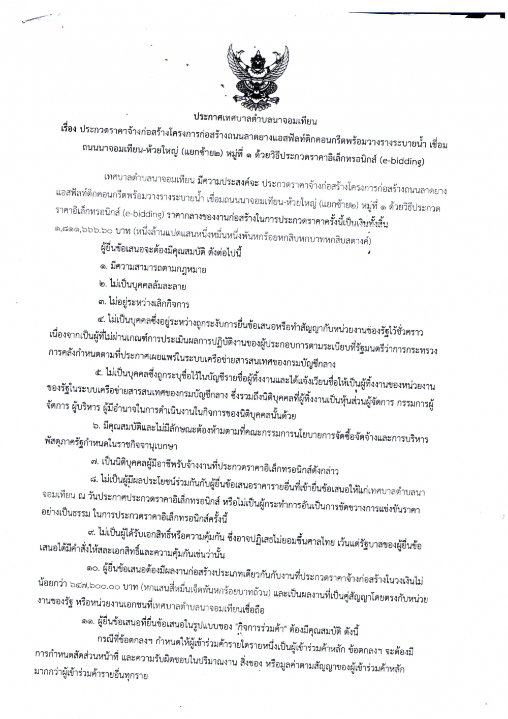 ประกวดราคาจ้างก่อสร้างโครงการก่อสร้างถนนลาดยางแอสฟัลท์ติกคอนกรีตพร้อมวางรางระบายน้ำเชื่อมถนนนาจอมเทียน-ห้วยใหญ่ (แยกซ้าย ๒ หมู่ที่๑)