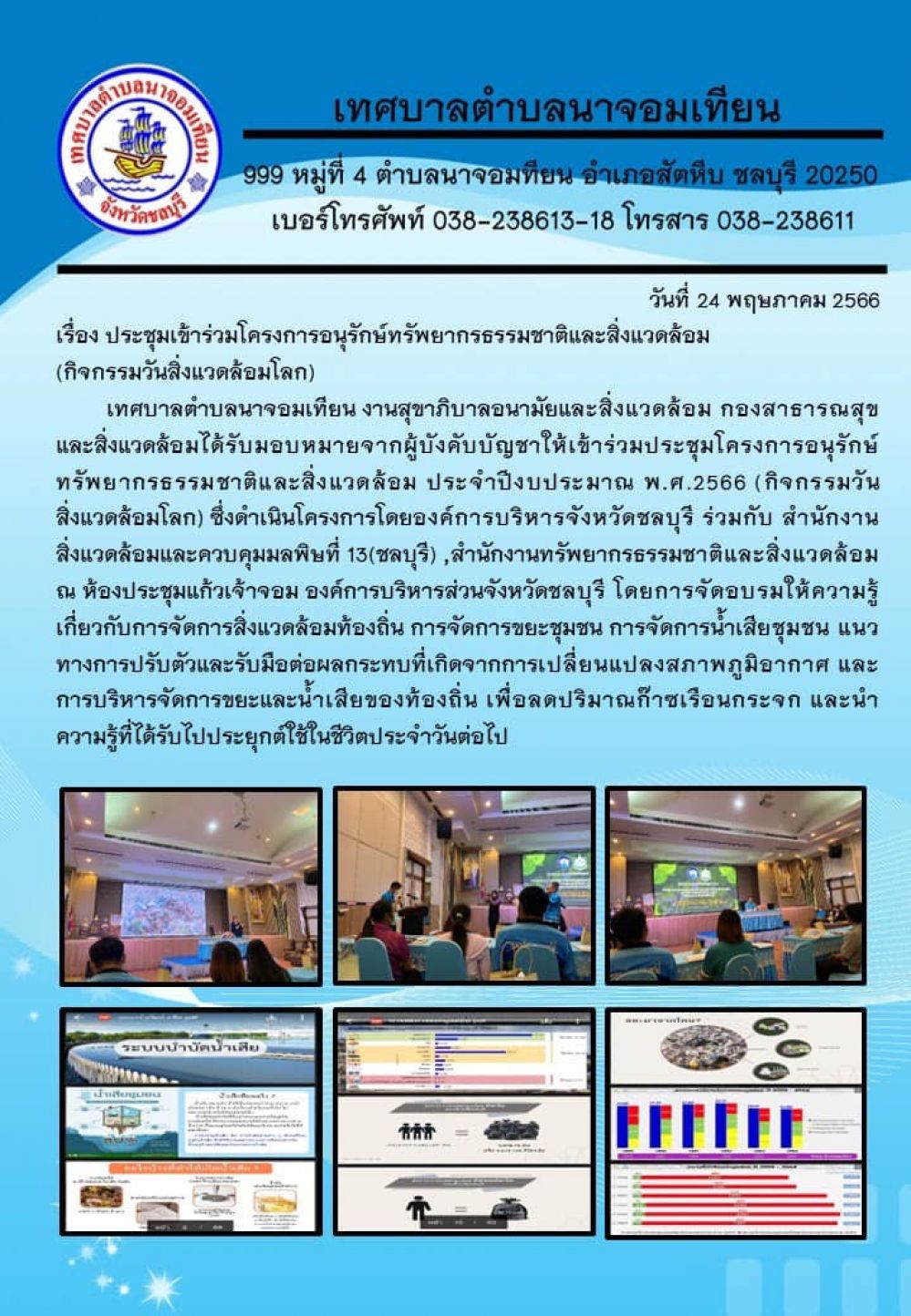 วันพุธที่ 24 พฤษภาคม 2566 ผู้บริหารเทศบาลโดย นางสาวระพีพรรณ รัตนเหลี่ยม มอบหมายให้งานสุขาภิบาลอนามัยและสิ่งแวดล้อม กองสาธารณสุขและสิ่งแวดล้อมได้รับมอบหมายจากผู้บังคับบัญชาให้เข้าร่วมประชุมโครงการอนุรักษ์ทรัพยากรธรรมชาติและสิ่งแวดล้อม ประจำปีงบประมาณ พ.ศ.2566 (กิจกรรมวันสิ่งแวดล้อมโลก) ซึ่งดำเนินโครงการโดยองค์การบริหารจังหวัดชลบุรี ร่วมกับ สำนักงานสิ่งแวดล้อมและควบคุมมลพิษที่ 13(ชลบุรี) ,สำนักงานทรัพยากรธรรมชาติและสิ่งแวดล้อม ณ ห้องประชุมแก้วเจ้าจอม องค์การบริหารส่วนจังหวัดชลบุรี โดยการจัดอบรมให้ความรู้เกี่ยวกับการจัดการสิ่งแวดล้อมท้องถิ่น การจัดการขยะชุมชน การจัดการน้ำเสียชุมชน แนวทางการปรับตัวและรับมือต่อผลกระทบที่เกิดจากการเปลี่ยนแปลงสภาพภูมิอากาศ และการบริหารจัดการขยะและน้ำเสียของท้องถิ่น เพื่อลดปริมาณก๊าซเรือนกระจก และนำความรู้ที่ได้รับไปประยุกต์ใช้ในชีวิตประจำวันต่อไป
