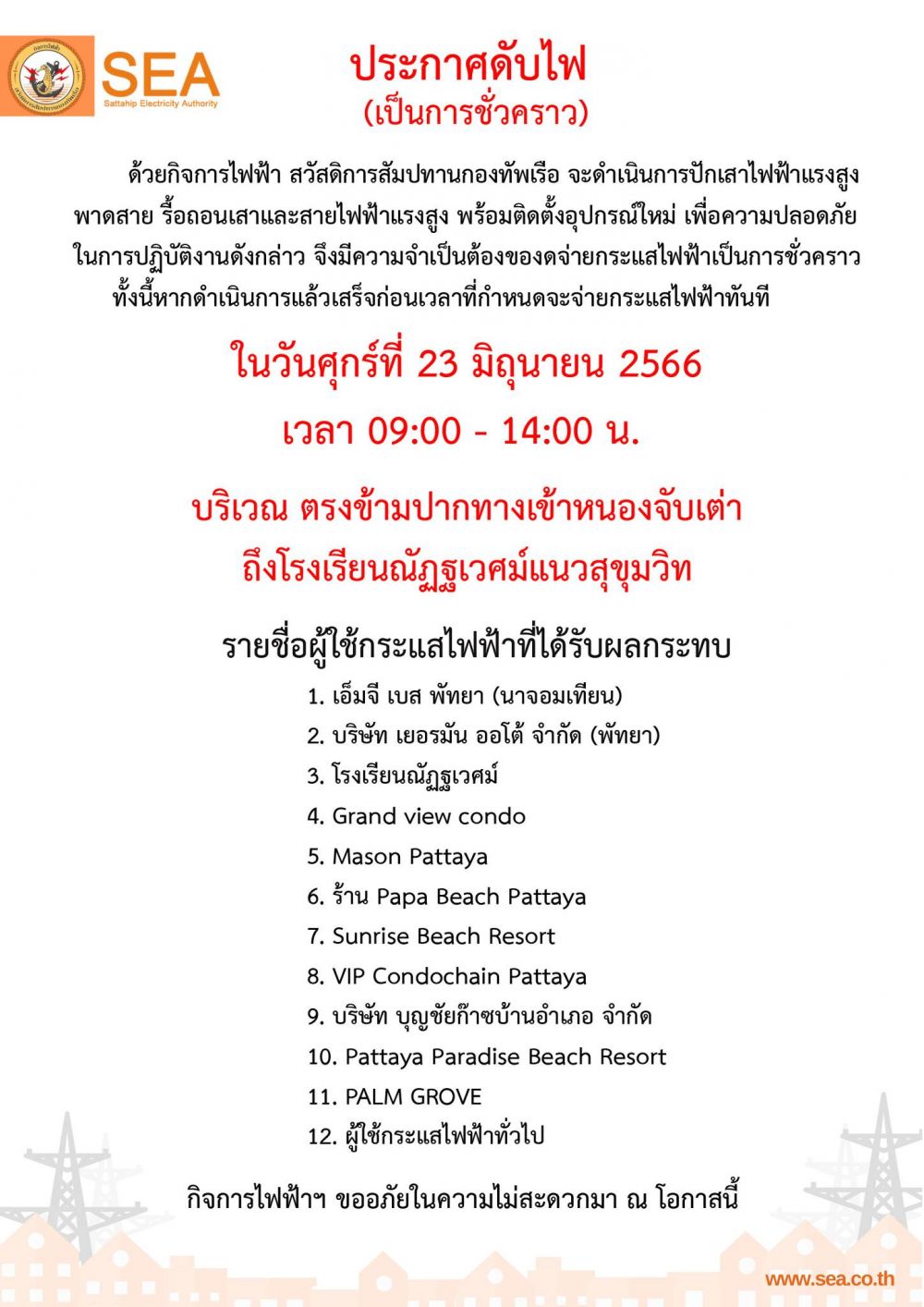 ประชาสัมพันธ์จากกิจการไฟฟ้า สวัสดิการสัมปทาน กองทัพเรือ จะดำเนินการปักเสาไฟฟ้าพาดสายปรับปรุงระบบไฟฟ้าแรงสูง พร้อมติดตั้งอุปกรณ์ใหม่ เพื่อความปลอดภัยในการปฏิบัติงาน จึงมีความจำเป็นต้องงดจ่ายกระแสไฟฟ้าเป็นการชั่วคราว ในวันศุกร์ที่ 23 มิถุนายน 2566 เวลา 09.00 - 14.00 น. บริเวณ ตรงข้ามปากทางเข้าหนองจับเต่าจนถึงโรงเรียนณัฏฐเวศม์แนวสุขุมวิท