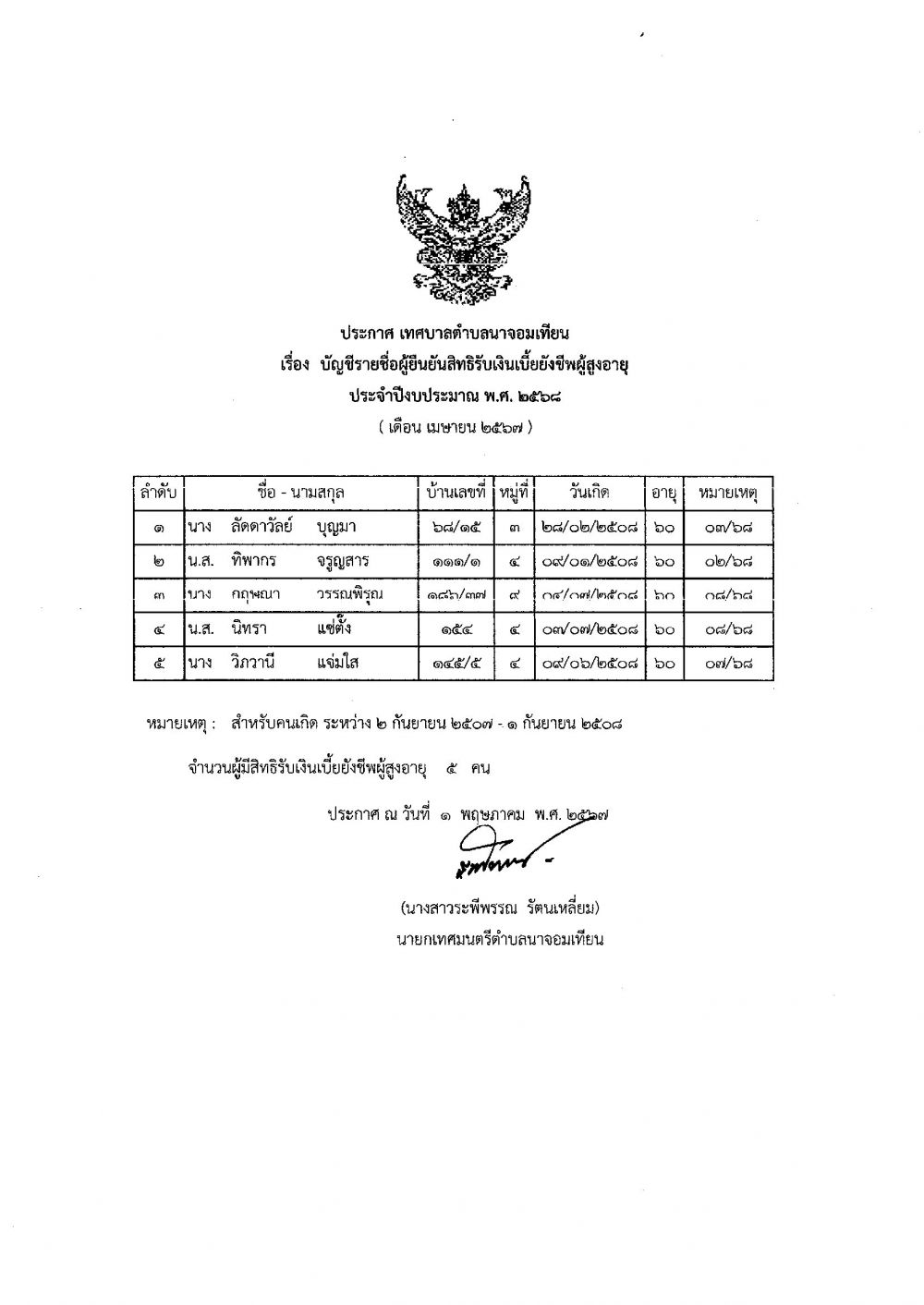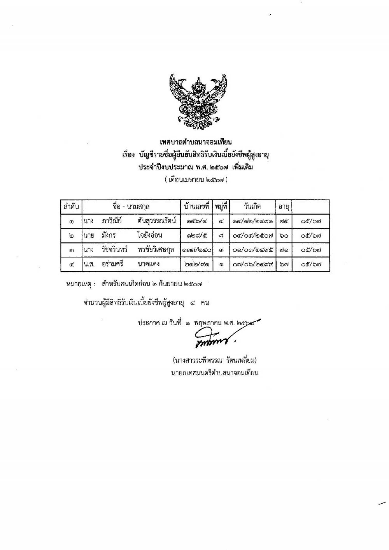 ประกาศ เรื่อง บัญชีรายชื่อผู้ยืนยันสิทธิ์รับเบี้ยยังชีพผู้สูงอายุ ประจำปีงบประมาณ พ.ศ.๒๕๖๗ เพิ่มเติมเดือนเมษายน ๒๕๖๗