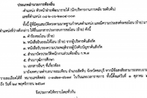 ประชาสัมพันธ์ เรื่อง รับโอน (ย้าย) พนักงานเทศบาล หรือพนักงานส่วนท้องถิ่นประเภทอื่น เพื่อแต่งตั้งให้ดำรงตำแหน่งสายงานผู้บริหารที่ว่าง