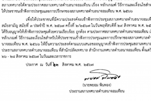 การเข้าฟังการประชุมสภาเทศบาลตำบลนาจอมเทียน สมัยสามัญ สมัยที่ ๓ ประจำปี พ.ศ. ๒๕๖๖ ครั้งที่ ๒/๒๕๖๖